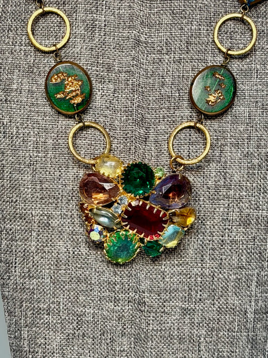 FLORAL POLYMER CLAY PENDANT WITH SWAROVSKI CRYSTAL CENTER ON MULTI STRAND STAINLESS STEEL NECK WIRE PCN880