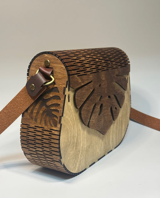 CUSTOM BUILT WOODEN PURSE WITH BROWN LEATHER STRAP MN112P