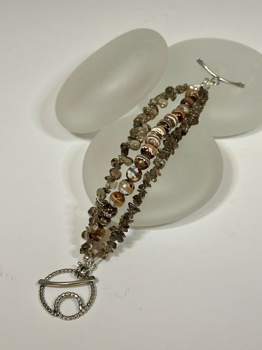 .925 TRIPLE SSTRAND WINK BRACELET WITH BROWN BANDED AGATE AND SMOKEY QUARTZ BR355