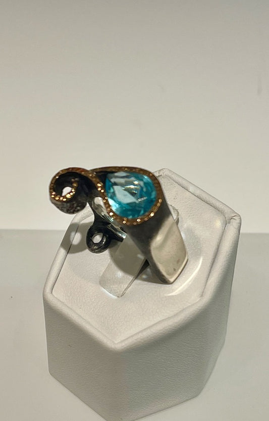 BLUE QUARTZ OXIDIZED RING WITH STERLING SILVER AND 14K GOLD BR0971