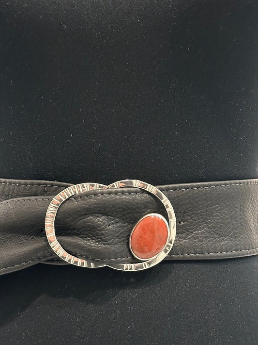 CUSTOM OVAL AND AGATE BELT BUCKLE AND GARMENT DYED LEATHER BELT WITH STERLING SILVER MB7B