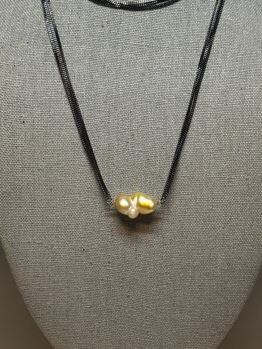 GOLDEN SOUTH SEA BAROQUE KESHI PEARL WITH 18K YELLOW GOLD AND RUTENIUM STERLING SILVER NECKLACE AV2521