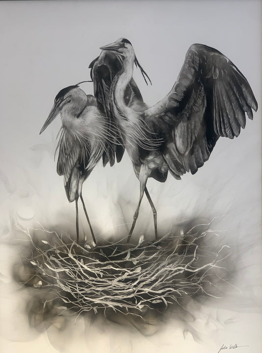 “Blue Herons Spring Nest” Fumage Drawing on Clay Board