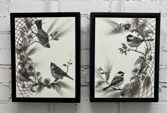 “Courting of the Black Capped Chickadees” Fumage Drawing on Clay Board