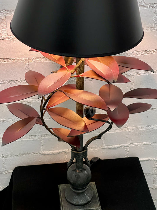 RED GINKGO HAND FORGED METAL LAMP WITH BLACK SHADE