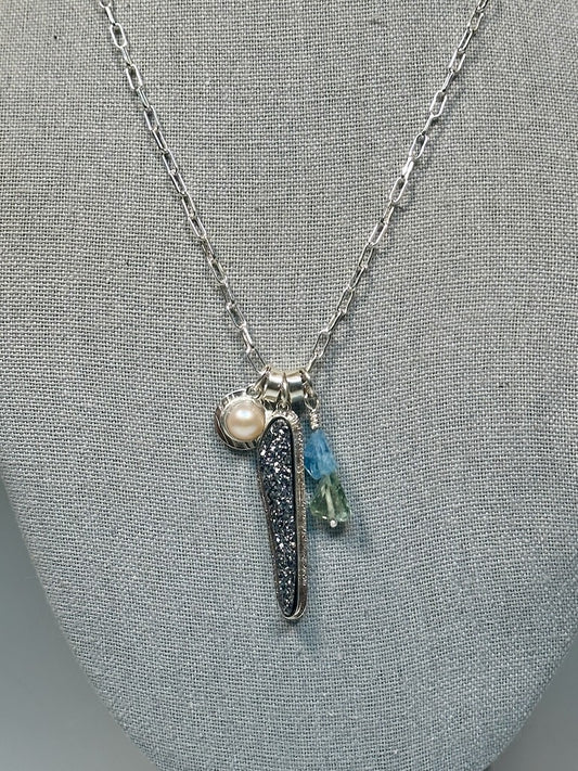 DRUZY, PEARL, AQUAMARINE STERLING SILVER NECKLACE - NM680N