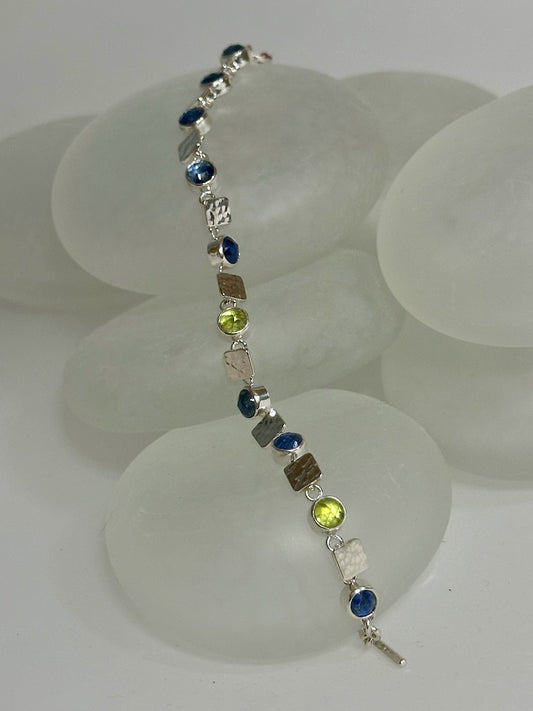 GEMSTONE QUALITY IOLITE, PERIDOT AND PATTERNED STERLING SILVER BRACELET NM552B