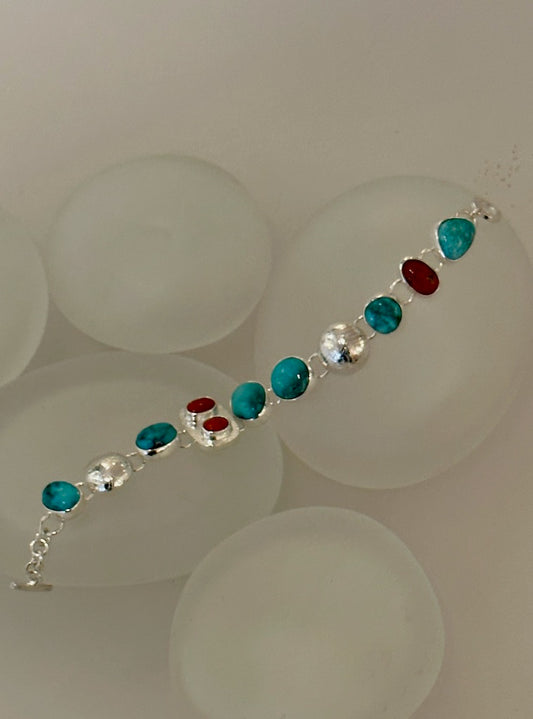 TURQUOISE AND VINTAGE ITALIAN CORAL STERLING SILVER BRACELET NM505B