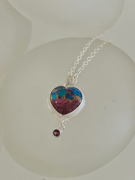 TURQUOISE/COPPER MATRIX HEART NECKLACE WITH RHODOLITE GARNET - NM667N