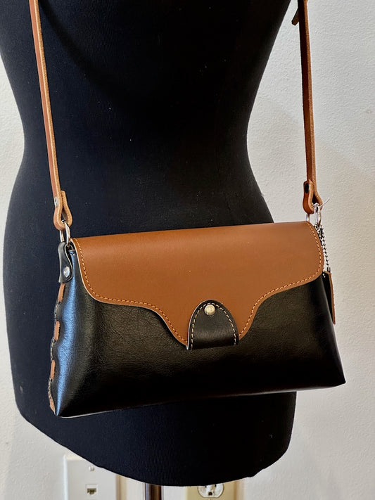 BLACK AND BROWN LEATHER SMALL FLAP HANDBAG WITH ADJUSTABLE STRAP II300B