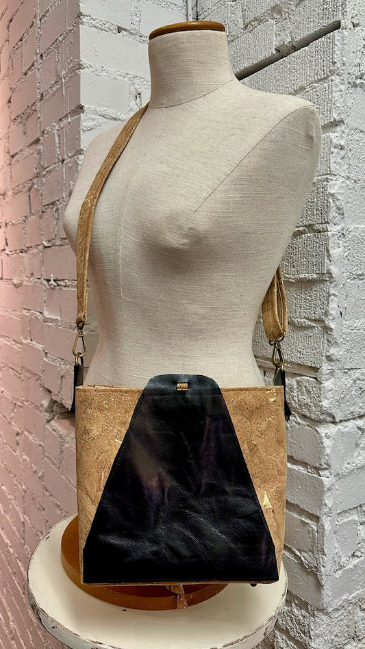 BLACK AND TAN LEATHER AND CORK CROSSBODY BAG