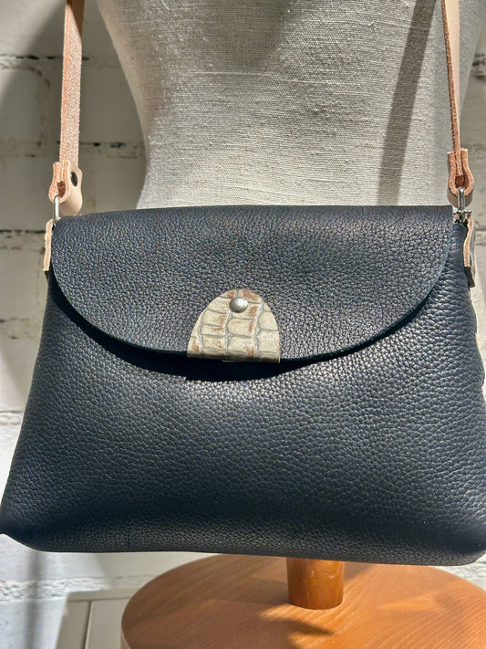 BLACK LEATHER WITH CROCODILE LEATHER CROSSBODY HANDBAG WITH ADJUSTABLE STRAP II222