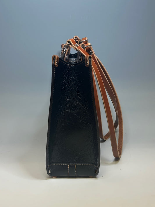 BLACK LEATHER SCALLOP HANDBAG TOTE WITH COLLAR CLOSURE AND BROWN ACCENTS II270