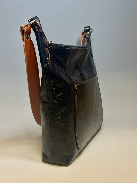 BLACK LEATHER HOBO BAG WITH BROWN STRAP II274