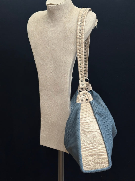 BLUE LEATHER AND TAN CROCODILE EMOBOSSED LEATHER HANDBAG II209