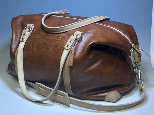DISTRESSED COGNAC SOFT LEATHER TRAVEL BAG W/DOUBLE STRAP AND CROSSBODY STRAP II288