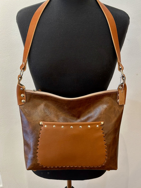 DISTRESSED BROWN LEATHER ZIPPER HANDBAG WITH EXTERNAL POCKET II264