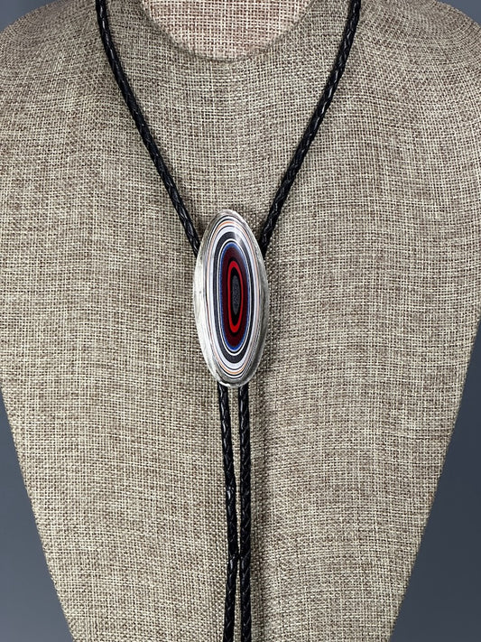 FORDITE CABOCHON BOLO IN STERLING SILVER BEZEL WITH AFRICAN GLASS BEADS, RED FACETED BEADS ON BLACK LEATHER CORD JH53