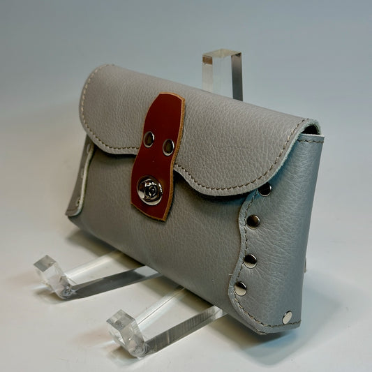 GREY AND TAN LEATHER CARRY ALL POUCH WITH FRONT CLASP CLOSURE IIW104