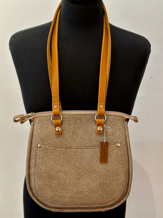 LIGHT PEBBLE TAN HANDBAG WITH BROWN ACCENT STRAP II262