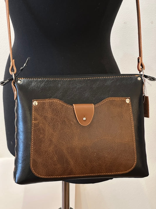 MEDIUM BLACK/BROWN LEATHER ZIPPER HANDBAG WITH EXTERNAL POCKET II302