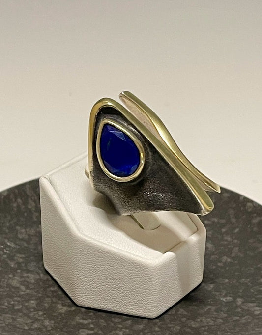 OXIDIZED STERLING SILVER AND 14K LARGE OPEN WRAP RING WITH LAPIS BR325275