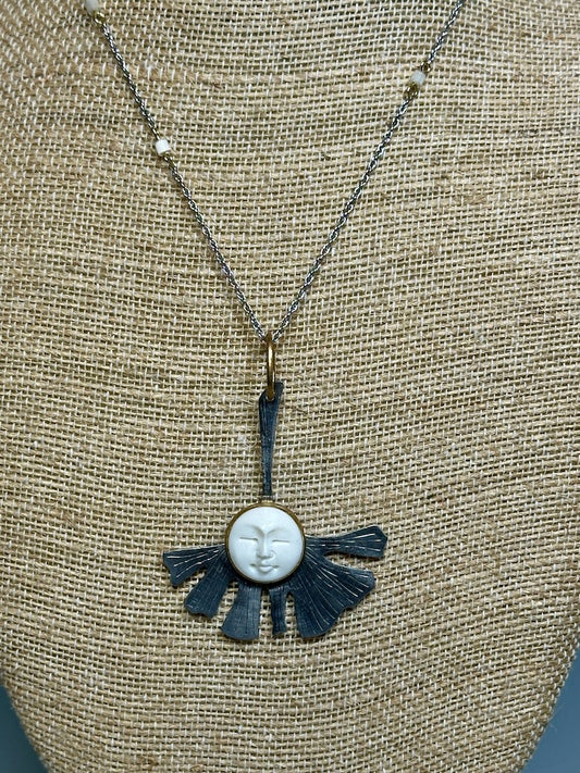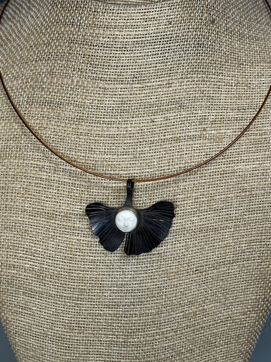 RESILIENCE CHOKER NECKLACE WITH COPPER GINGKO LEAF AND WATER BUFFALO BONE MOON FACE CABACHON JH46