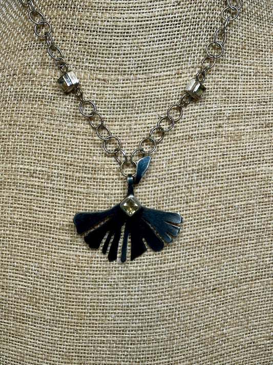 RESILIENCE COPPER VERDIGRIS GINKGO WITH FLAME COPPER MEDALLION & MOSAIC ABALONE SHELL ON COPPER CHEVRON BEAD CHAIN NECKLACE JH146