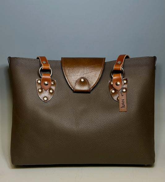 TAUPE AND BROWN LEATHER COMPUTER TOTE II278