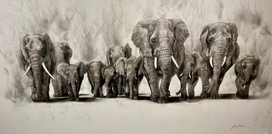 “The Elephant Family” Original Fumage Drawing on Clay Board/Custom Framed
