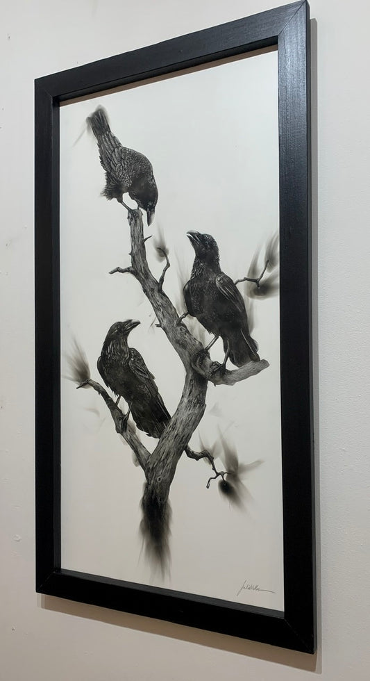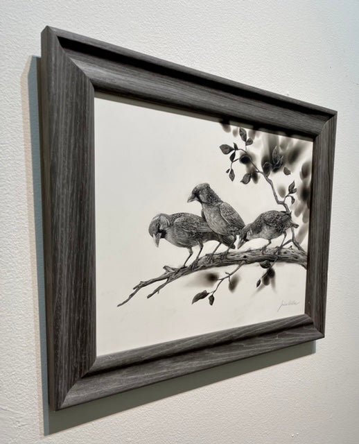 “Three Chicks - Black Drongos” Fumage Drawing on Clay Board