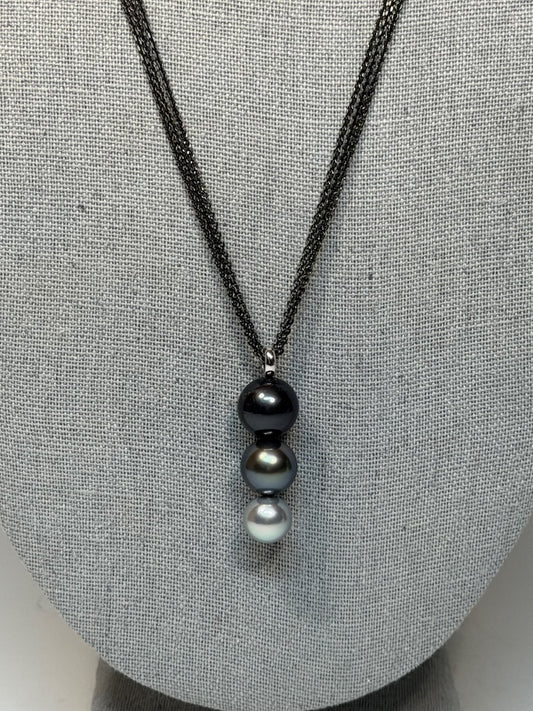 18K WHITE GOLD FANCY ROUND TAHITIAN PEARL TRIOL PENDANT ON STERLING SILVER RUTHENIUM CHAIN NECKLACE AV2617 & AV2618 SET