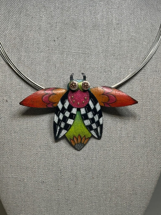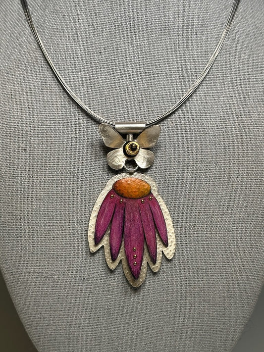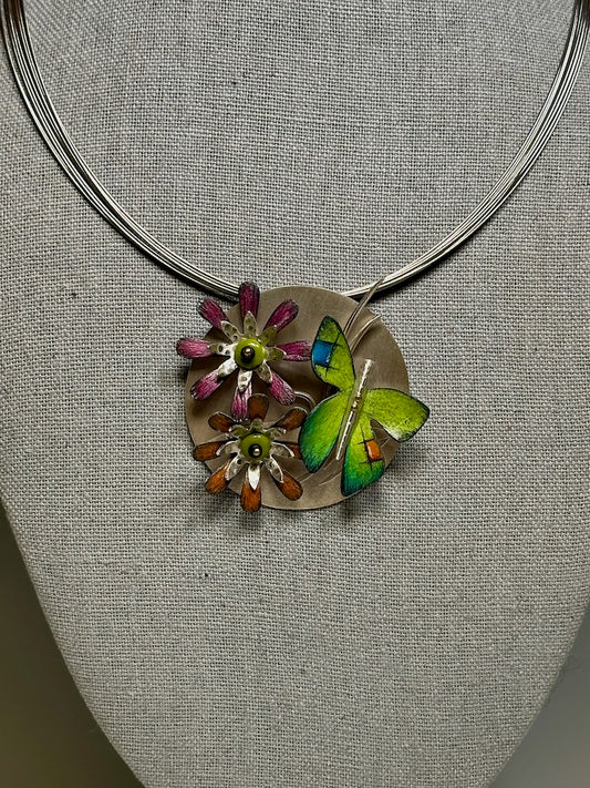 ECHINACEA AND BUTTERFLY NECKLACE ON STAINLESS 16" MULTI-CABLE NECK WIRE WITH 18K GOLD VERMEIL BEAD DK258