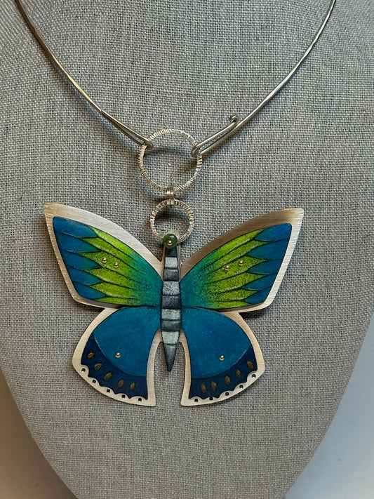 TEAL BUTTERFLY NECKLACE ON STERLING WIRE COLLAR DKA232