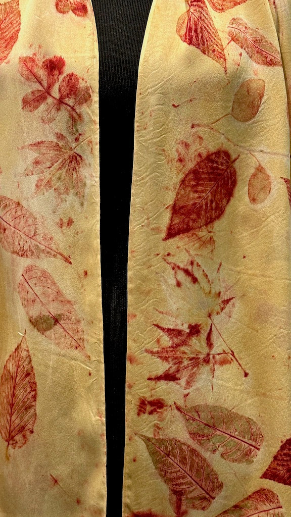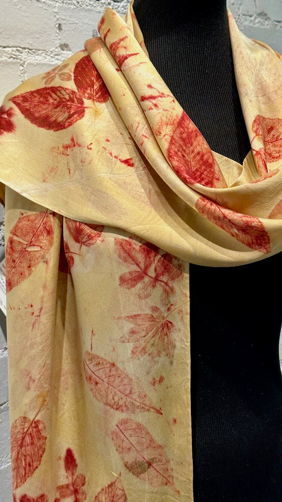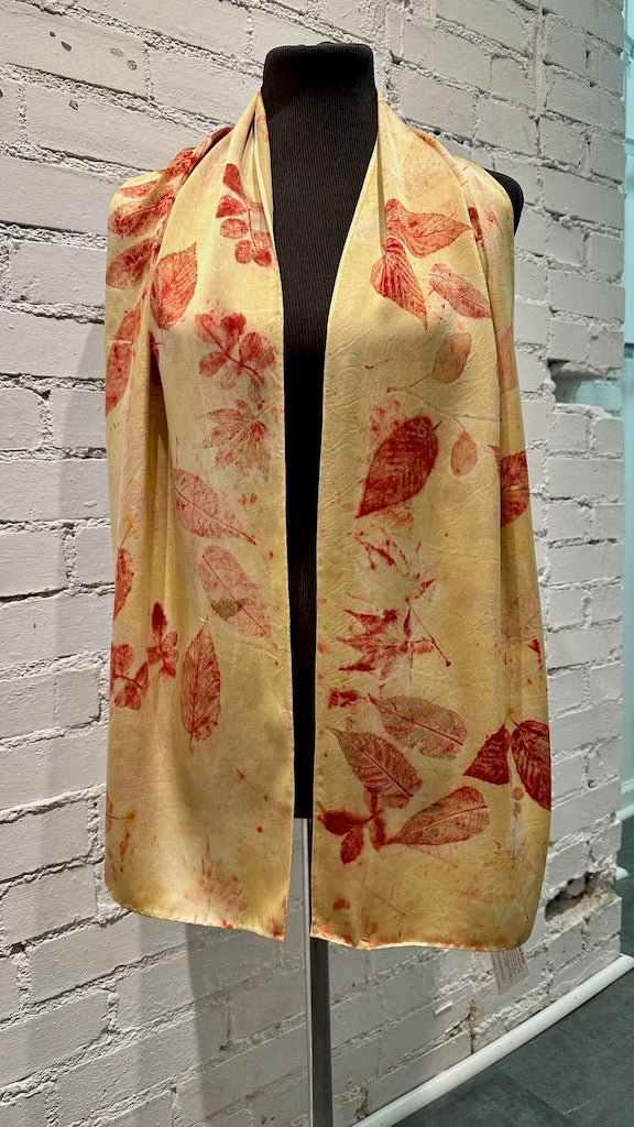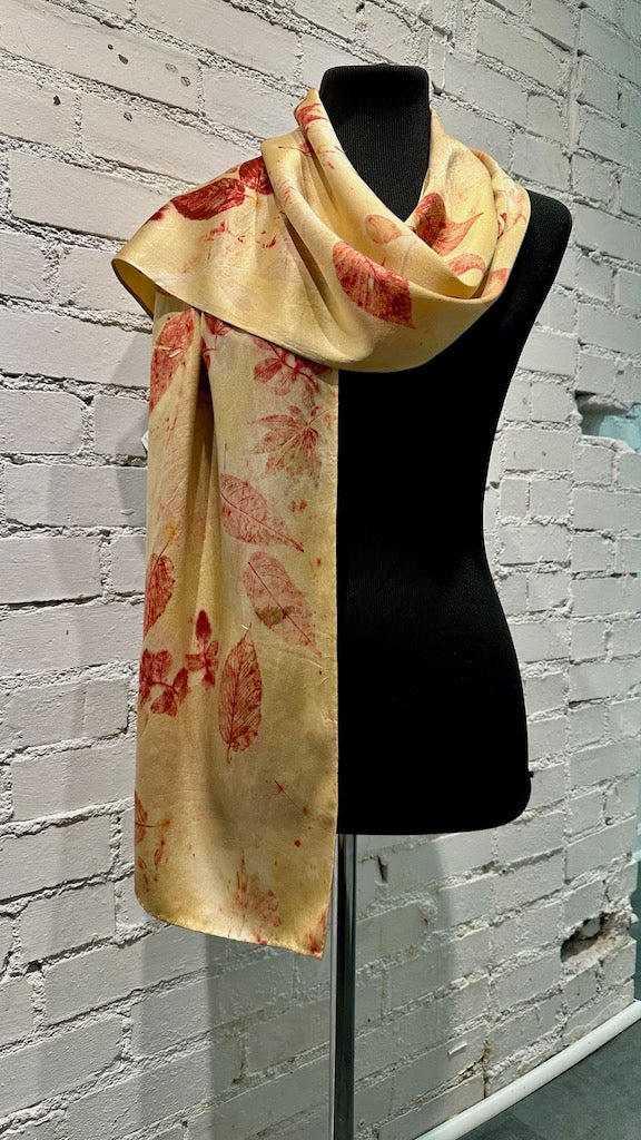 HAND DYED 100% CHARMEUSE ECO-PRINTED SCARF WITH MARIGOLD AND MADDER ROOT NATURAL DYES