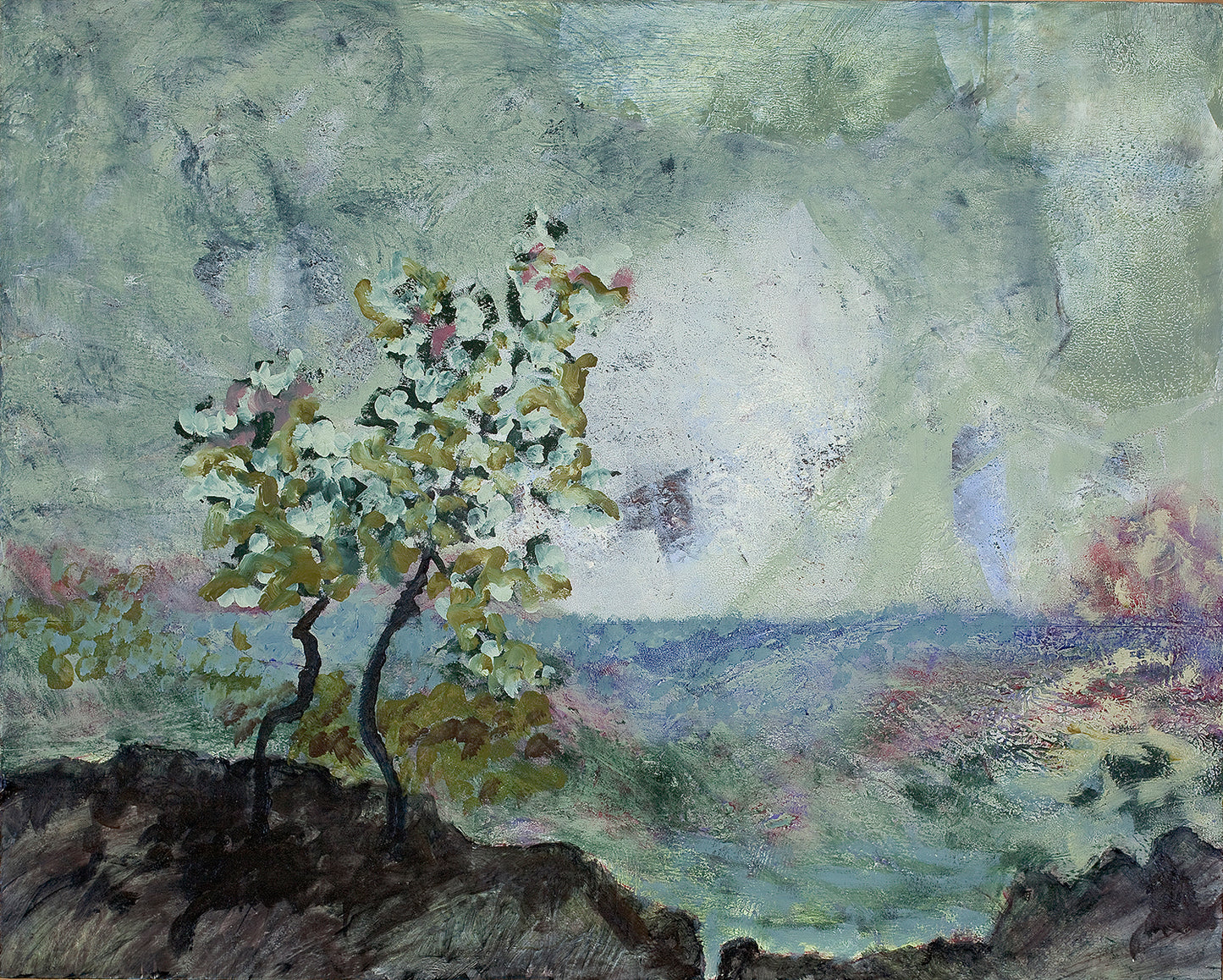Oil and cold wax on cradled board and framed in a 2”D wood frame ready to hang.