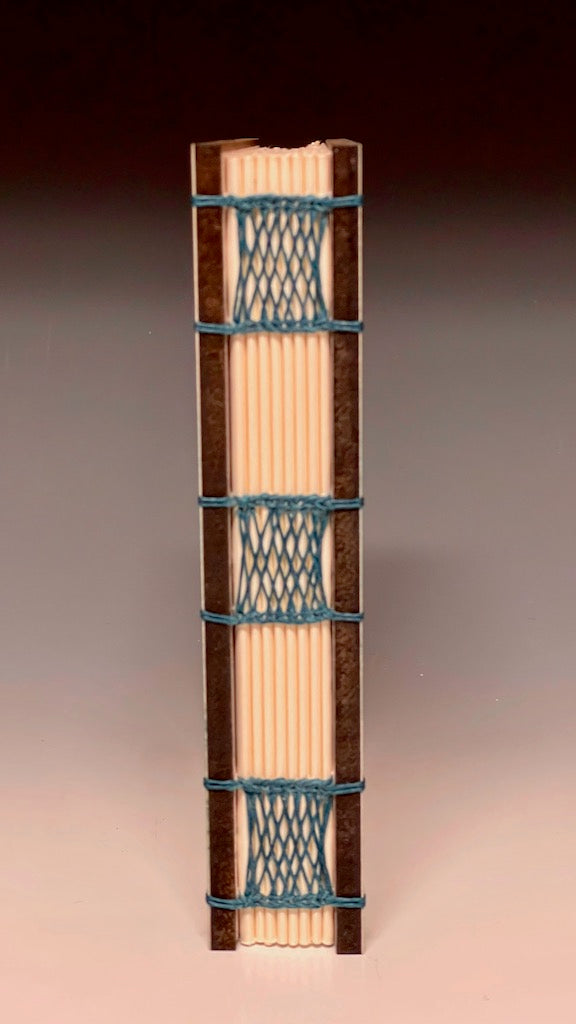 These complex, challenging bindings expand my personal boundaries, and there is a push and pull between the creative chaos of artistic design and the calm meditation of binding the books. She becomes centered, refreshed, as she goes through the motions of tearing page after page and sewing book after book.