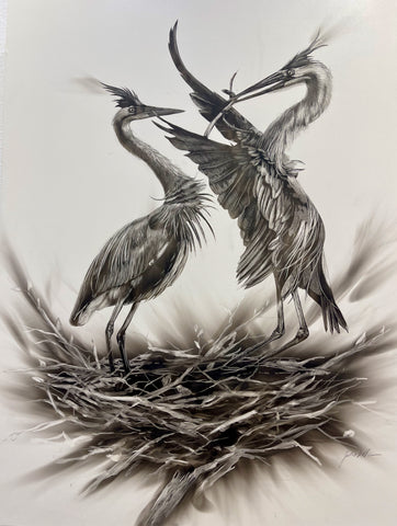 "THE ACORN WOODPECKERS" Original Fumage Drawing on Clay Board/Framed