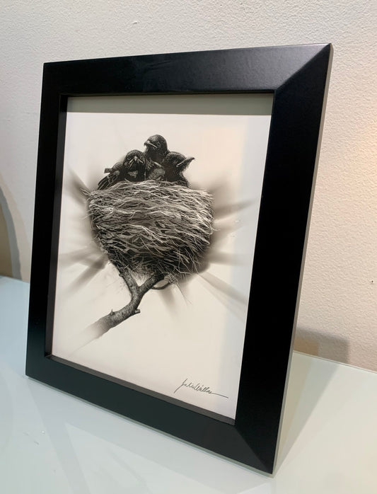 “Three Chicks - Black Drongos” Fumage Drawing on Clay Board
