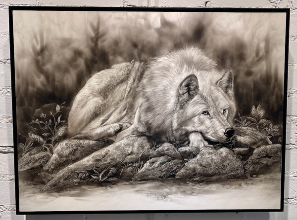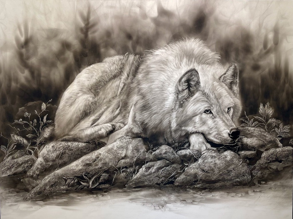 "The Resting Wolf” Fumage Drawing on Clay Board