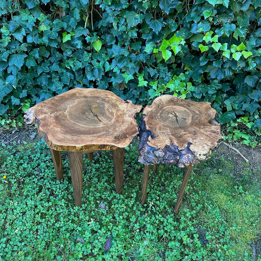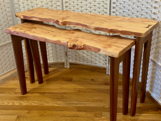 TWO AMBROSIA MAPLE NESTING TABLES WITH WALNUT LEGS