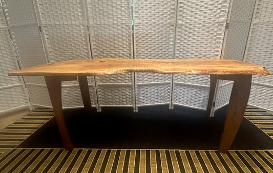 RED OAK BURL COFFEE TABLE WITH AMBROSIA MAPLE LEGS