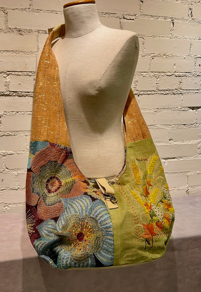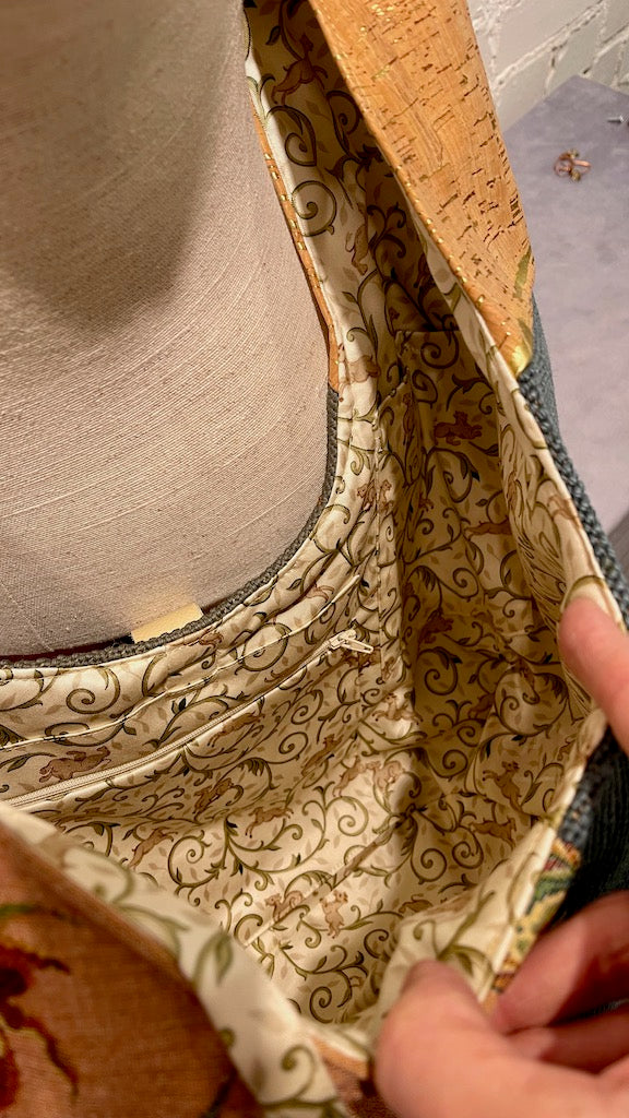 This handbag has been handcrafted using vintage tapestries and fabric which create a fine wearable art crossbody bag. Inner zipper pocket for convenience. Each one is one of a kind. Soft deer suede on top of strap for incredible comfort along with a detachable handmade fabric flower pin.