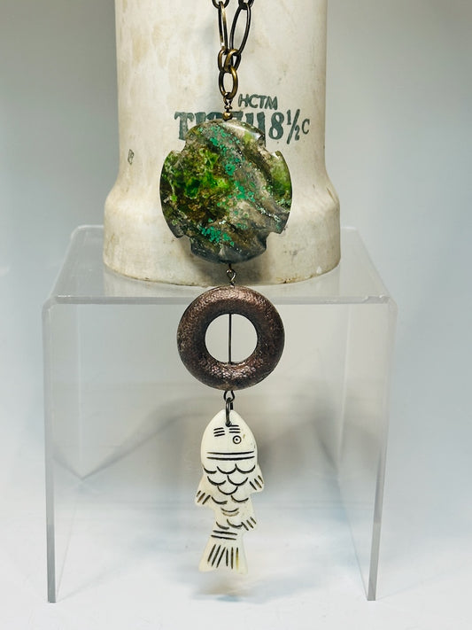 MIXED MEDIA ADJUSTABLE STATEMENT NECKLACE WITH BRASS, LEATHER, TURQUOISE AND CARVED FISH LCN2021