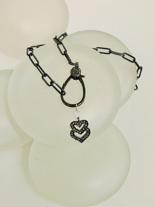 OXIDIZED STERLING SILVER AND DIAMOND LARGE LOBSTER CLASP AND DOULBE HEART STATEMENT NECKLACE LCN2017