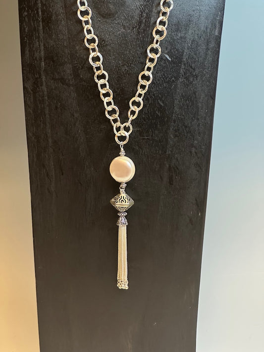 HAMMERED SILVER CHAIN NECKLACE WITH FRESH WATER PEARL AND STERLING SILVER TASSEL LCN672