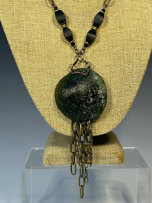 ANCIENT ROMAN GLASS PENDANT WITH BRASS AND MALACHITE STATEMENT NECKLACE LCN547