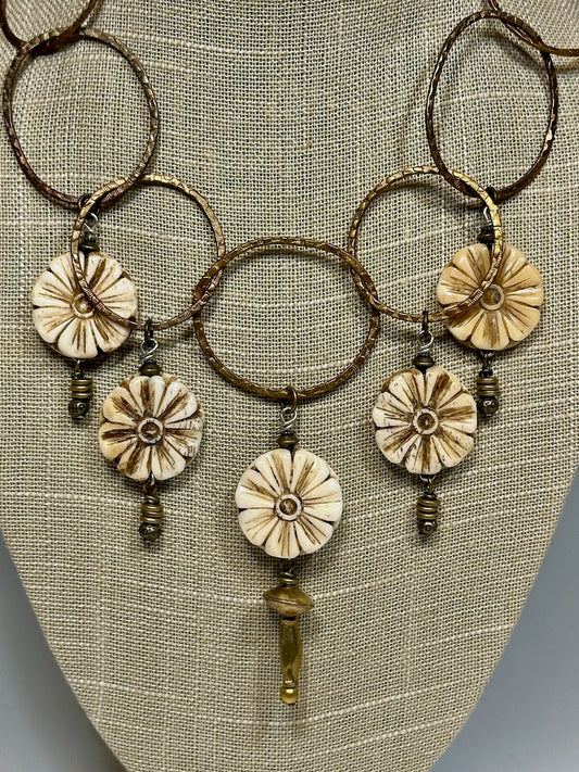 CARVED WOOD FLOWERS AND BRASS STATEMENT NECKLACE LCN551