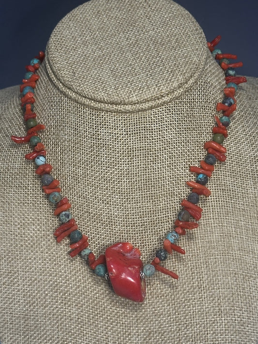 NATURAL TURQUOISE AND CORAL STATEMENT NECKLACE LCN925