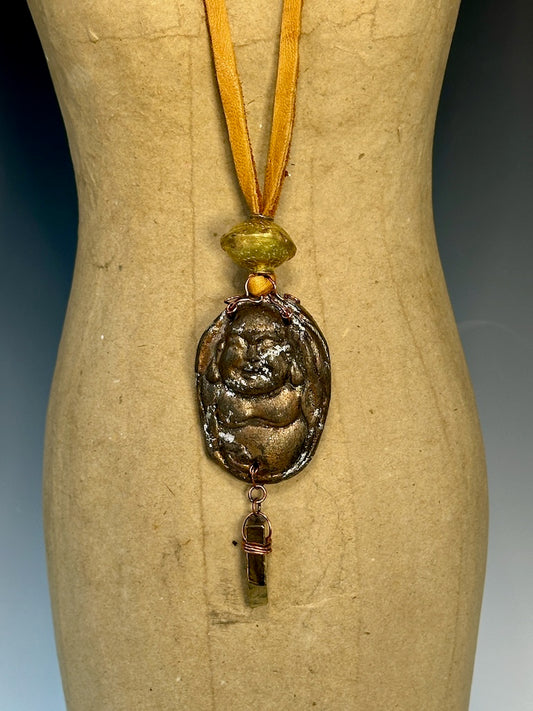 CLAY BUDDHA PENDANT LONG NECKLACE WITH DEER SUEDE LCN914